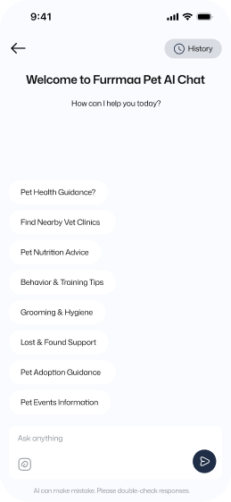 Get instant, reliable support for your pet anytime, anywhere. Furrmaa Pet AI Chat is designed exclusively for our mobile app, giving pet parents fast, personalized guidance in just a few taps.